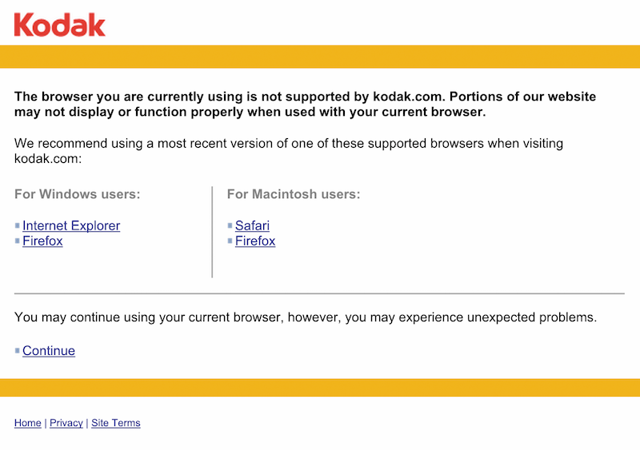 Graceful degradation assumes that an experience is going to be worse on older, less capable browsers and devices. To address potential problems, it recommends that developers take steps to avoid throwing errors—JavaScript or otherwise—for their users. Under this philosophy, a developer can take a range of approaches ranging from making everything work perfectly in down-level browsers to only addressing egregious errors or even chosing to block certain browsers from accessing the content if they are known to have problems. We saw this latter approach often with Flash-only sites, but it wasn’t limited to them. I used this “roadblock” example from Kodak.com in my book:
